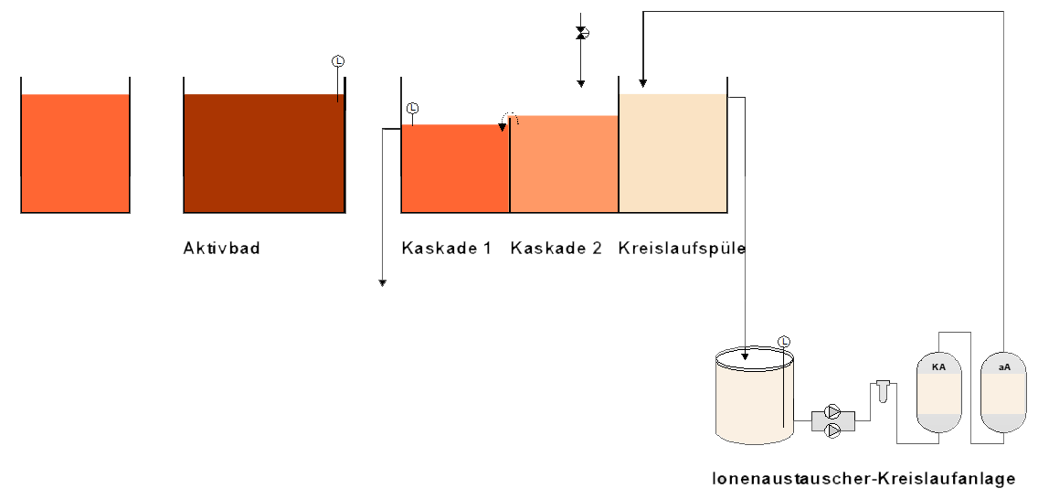 Mit der Kreislaufanlage wird die letzte Spüle einer Kaskadenspüle (die, die am wenigsten belastet ist) in eine Kreislaufspüle umgewandelt. Das Wasser fährt also permanent in einem geschlossenen Kreislauf und spart so Frischwasser ein. Dabei werden die verunreinigenden Metallionen entfernt.